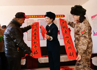 遼寧省朝陽市龍城區聯合鎮長立哈達村,朝陽軍分區官兵給幫扶老年人送春聯。
