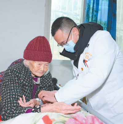四川省眉山市丹稜縣仁美鎮雄義村,村醫徐遠利(右)為92歲的張玉珍測量血壓。