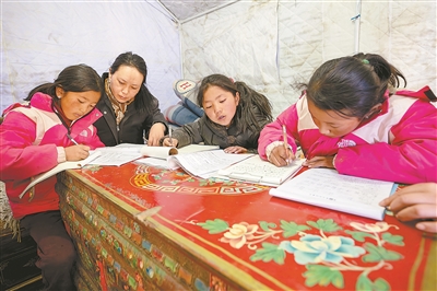 西藏自治區日喀則市薩迦縣普村的安置點內,黨員次央(左二)在輔導村裏的小朋友寫作業。