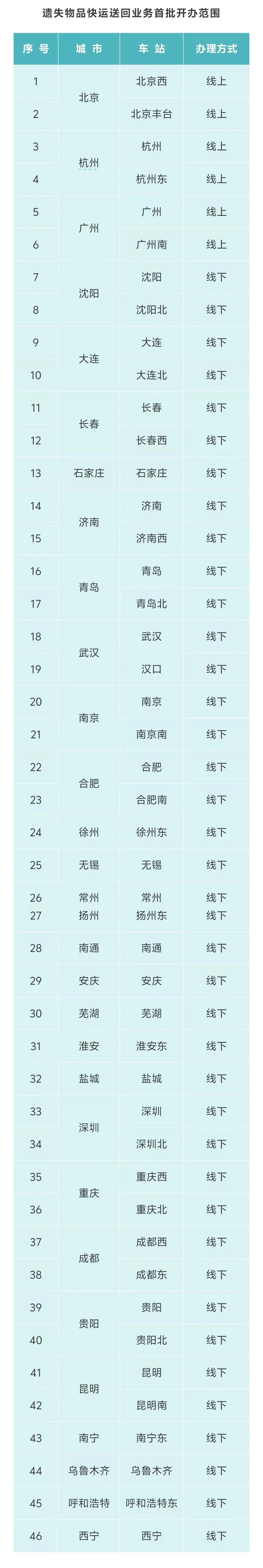 記者看到,上述消息還稱,除了6個試點車站試點開展遺失物品線上預約快運送回服務外,瀋陽北站、長春西站、石家莊站、濟南西站、武漢站、南京南站、合肥南站、成都東站、貴陽北站、昆明南站、南寧東站、烏魯木齊站、呼和浩特東站、西寧站等40個重點車站,旅客也可以通過撥打中鐵快運官方客服電話95572預約線下辦理。