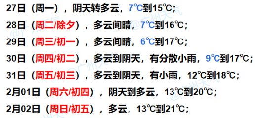1月27日(臘月廿八),廣東西部市縣多雲,東部市縣晴到多雲,最低氣温:中北部市縣2~5℃,高海拔山區零下3~1℃,有冰凍或霜凍,南部市縣6~10℃。