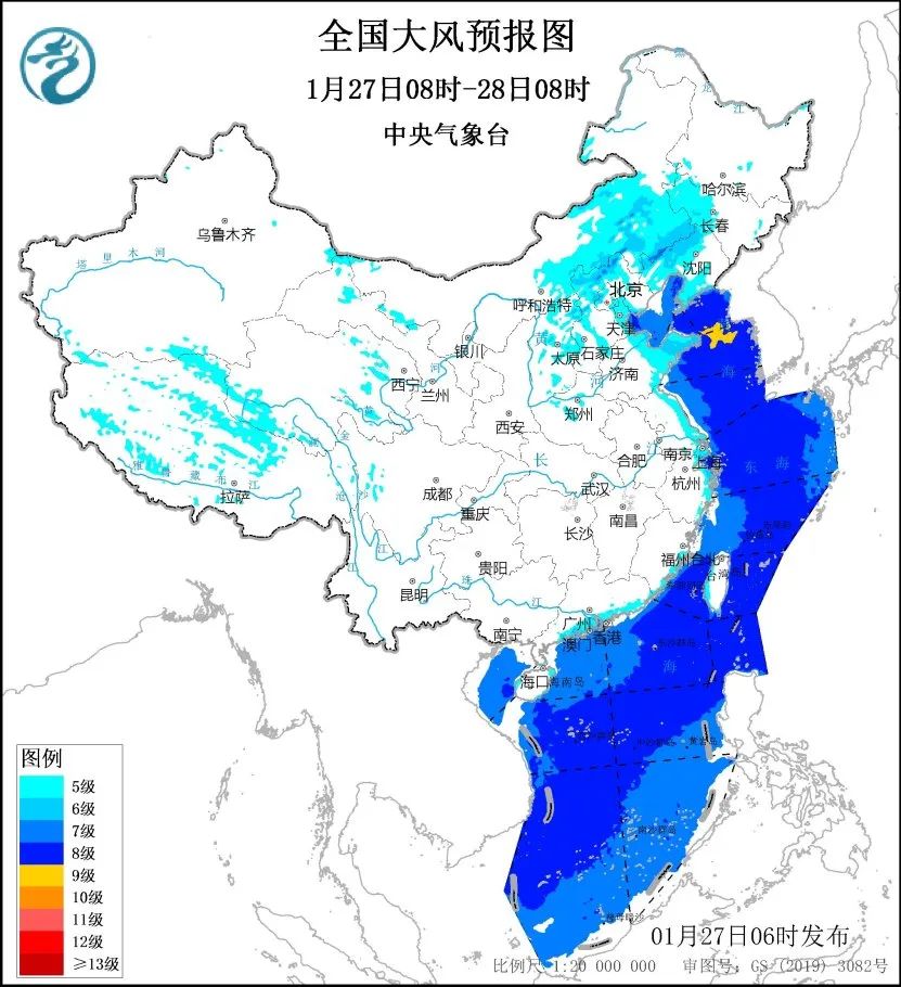 預計,1月27日08時至28日08時,西藏、內蒙古中東部、遼寧西部和南部、河北大部、北京、天津、山東大部、江蘇東部、上海、浙江沿海、福建沿海、廣東沿海等地部分地區將有5級左右偏北風、陣風7至9級;渤海、渤海海峽、黃海、東海、台灣海峽、台灣以東洋麪、巴士海峽、南海大部、北部灣將有7至8級、陣風9至10級的大風,其中黃海的部分海域風力可達9級、陣風10至11級。