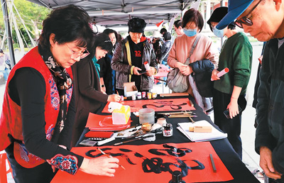 過年,少不了寫春聯、貼春聯。1月25日,台北故宮博物院聯手島內相關書法協會舉辦“新春揮毫贈春聯活動”,多位書法名家即席揮毫,書寫春聯、斗方,致贈民眾、除舊佈新。一段時日以來,台灣從北到南,幾乎各個縣市都舉辦了各種寫春聯、送春聯的活動。許多島內知名的書畫家與書法愛好者一起潑墨揮毫,寫下各種佳句以及“春”“福”等字,當場送給索取的民眾。