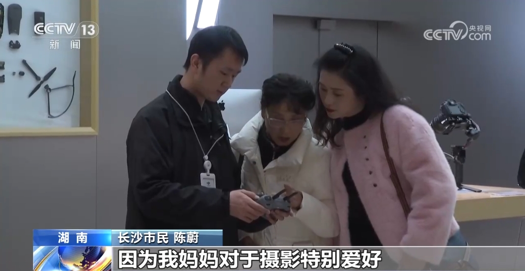 長沙市民 陳蔚: 我媽媽特別愛攝影,她覺得用無人機可以拍得更漂亮一些。在這裏偷偷講一句,今天不買,偷偷地買一個回家給她一個驚喜。