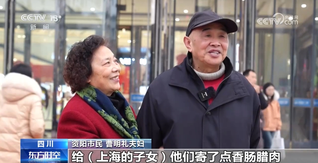 資陽市民 曹明禮夫婦 :老人總是牽掛孩子,給(上海的子女)他們寄了點香腸、臘肉。我們老兩口就在資陽過新年了,什麼禮物也不需要,就是多一點問候就行,抽空視頻問候問候就行。