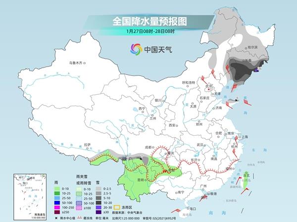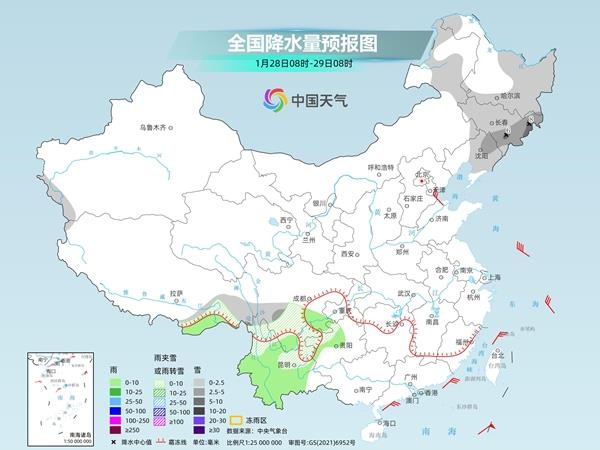 明天,新疆南疆西部山區、西藏東部、內蒙古東北部、東北地區大部、川西高原南部、雲南西北部和東北部、貴州北部等地部分地區有小到中雪或雨夾雪,其中,吉林東部局地有大雪。西藏東南部、雲南中西部等地部分地區有小雨。