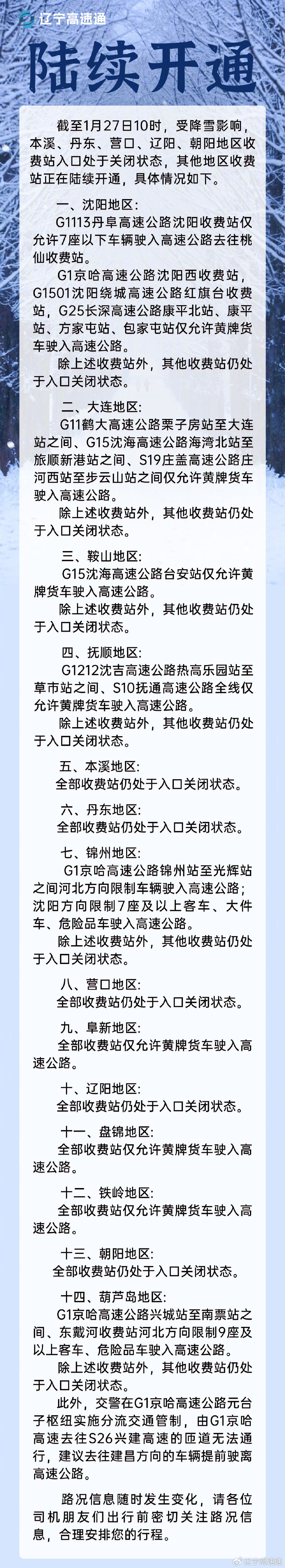 瀋陽、大連、鞍山、撫順、本溪、丹東、錦州、營口、阜新、遼陽、鐵嶺、盤錦地區和沈撫示範區有小雪到中雪,上述地區將出現道路積雪、結冰或濕滑。