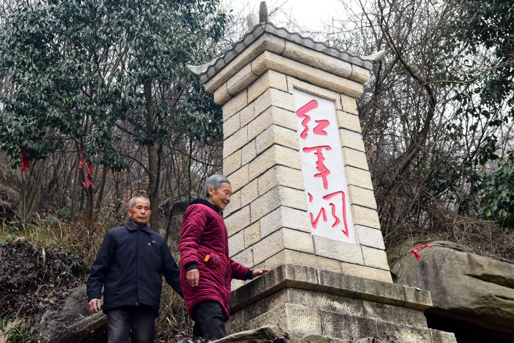 這是張愛華(右)和潘國章一起去查看“紅軍洞”紀念碑(1月23日攝)。新華社記者朱祥 攝
