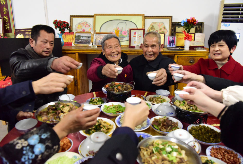 “今天的團圓飯菜單是二女兒擬的,吃的是紅軍宴。沒有大魚大肉,都是山裏菜。28個菜,代表着大別山‘28年紅旗不倒’。”