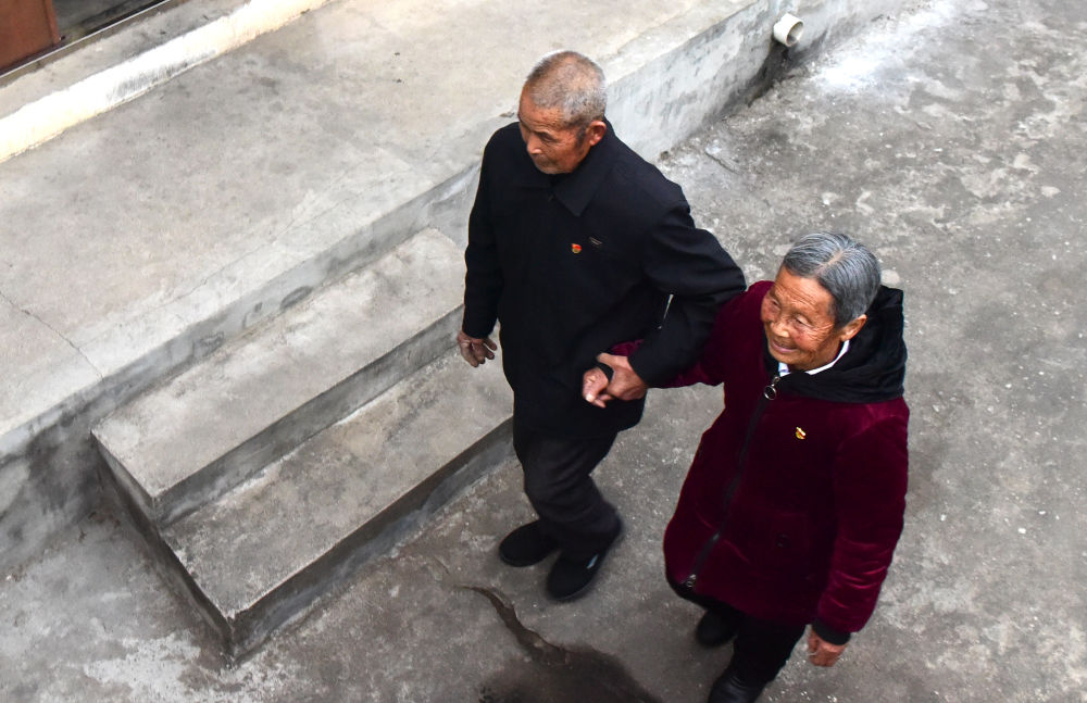 車剛進灣店村潘灣組,遠遠望見一座白牆黑頂的二層小樓,樓前一面紅旗伴着炊煙温柔搖曳,紅旗下,張愛華穿着一身暗紅色棉襖,和老伴兒潘國章手拉着手,翹首向我們張望着。