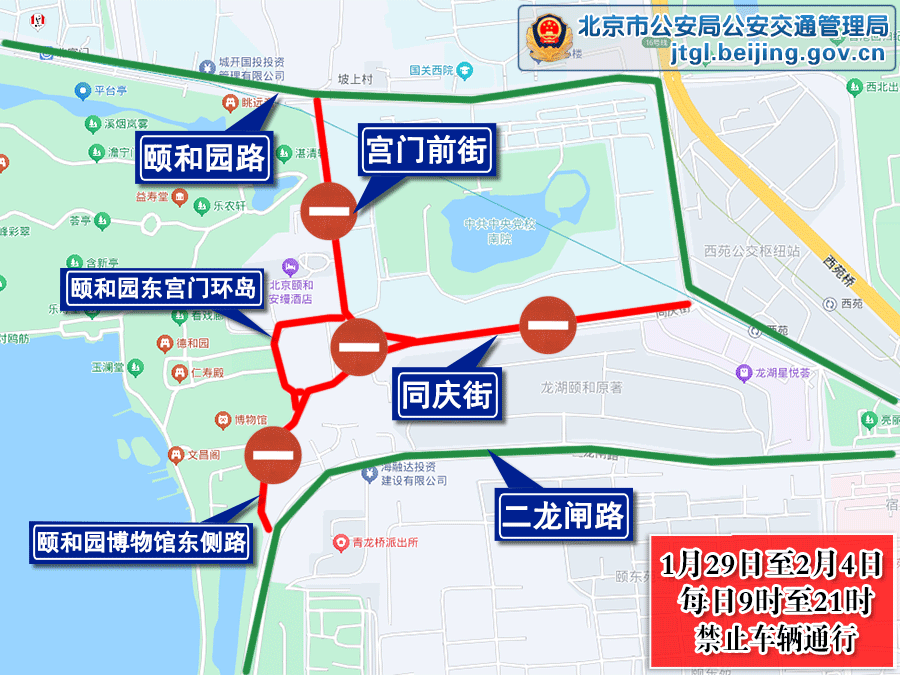 頤和園周邊部分路段禁止車輛通行。1月29日(正月初一)至2月4日(正月初七),每日9時至21時,同慶街、宮門前街、頤和園博物館東側路部分路段以及頤和園東宮門環島禁止車輛通行,途經車輛可繞行頤和園路和二龍閘路行駛。