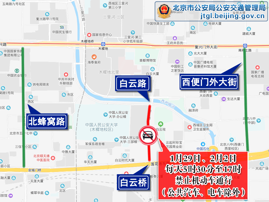 1月29日(正月初一)至2月2日(正月初五)每天5時30分至17時,白雲觀街西段、白雲觀前街禁止機動車通行。白雲觀濱河路等周邊道路將適時採取臨時交通管理措施,途經機動車可繞行蓮花池東路輔路行駛。
