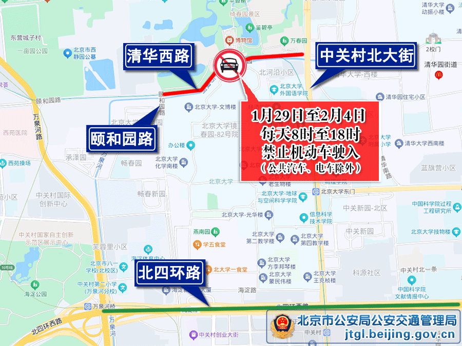 圓明園周邊部分路段禁止機動車駛入。1月29日(正月初一)至2月4日(正月初七),每天8時至18時,清華西路部分路段禁止機動車駛入(公共汽車、電車除外),途經機動車可繞行北四環路行駛。