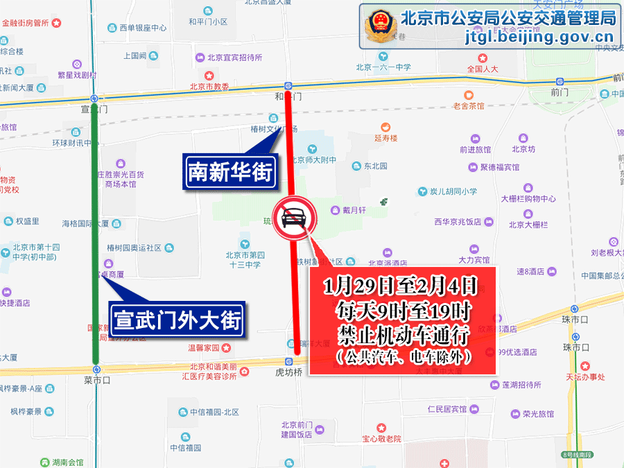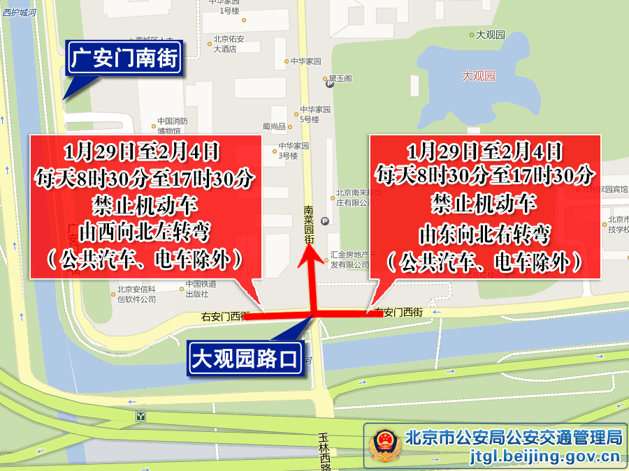 大觀園路口禁止機動車由西向北左轉、由東向北右轉。1月29日(正月初一)至2月4日(正月初七)每天8時30分至17時30分,大觀園路口禁止機動車由西向北左轉、由東向北右轉(公共汽車、電車除外),途經機動車可繞行右安門內大街和廣安門南街行駛。