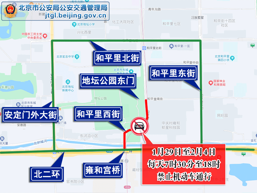 地壇公園周邊部分路段雙方向禁止車輛通行。1月29日(正月初一)至2月4日(正月初七)7時30分至18時,和平里西街部分路段雙方向禁止機動車通行。和平里中街、和平里南街、和平里西街、安定門外大街部分路段將適時採取臨時交通管理措施。途經機動車可繞行北二環路、和平里東街、和平里北街和安定門外大街行駛。