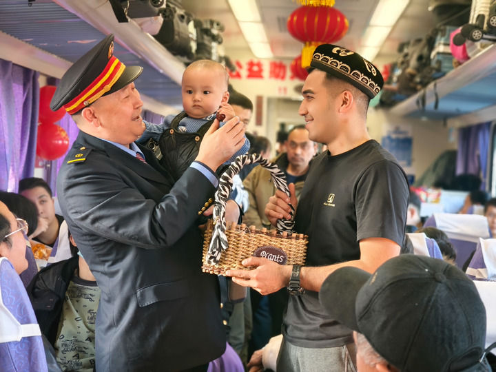 “列車巴扎開市啦!”1月25日早9點,祖國大西北,7558次“和田玉龍號”列車開出新疆和田站。沒多久,12號車廂裏就傳來列車長坡拉提汗的吆喝聲。車廂裏立馬熱鬧起來,售賣農副產品的吆喝聲、旅客的笑聲和交談聲奏響了歡樂的旋律……