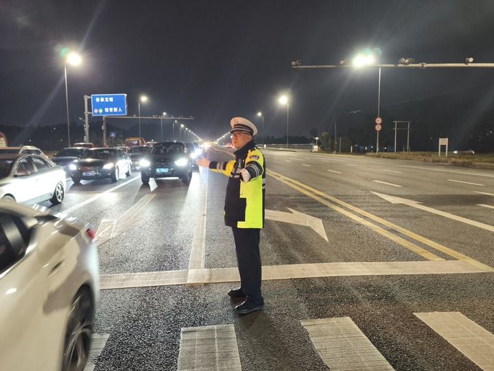 1月25日晚,張潔在樂山市蘇稽新區西岸路口指揮疏導交通。新華社發(劉冉攝)
