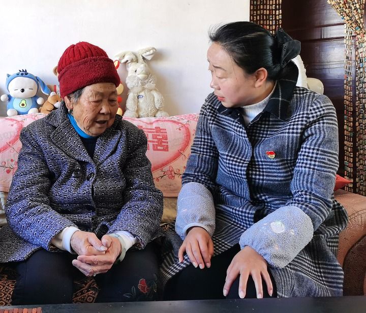 楊汝鈺(右)在社區一位老人家中進行入户慰問。新華社發(李建華攝)
