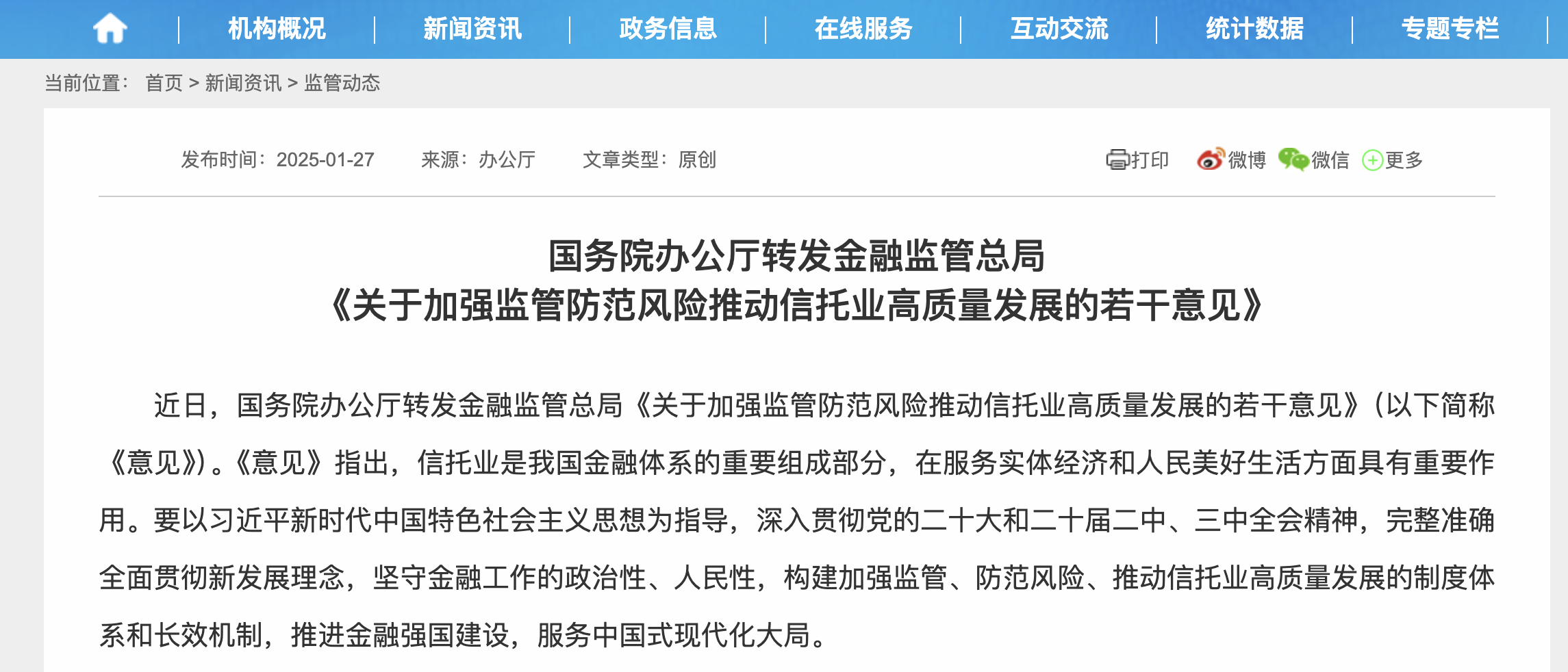 金融監管總局網站1月27日消息,近日,國務院辦公廳轉發金融監管總局《關於加強監管防範風險推動信託業高質量發展的若干意見》。《意見》指出,信託業是我國金融體系的重要組成部分,在服務實體經濟和人民美好生活方面具有重要作用。要構建加強監管、防範風險、推動信託業高質量發展的制度體系和長效機制,推進金融強國建設,服務中國式現代化大局。