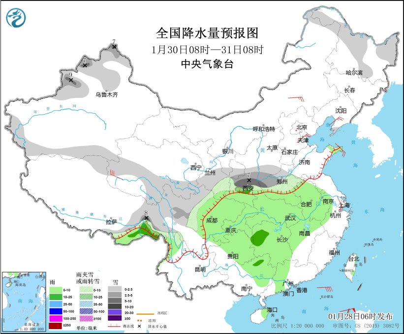1月30日至2月2日,青藏高原東部、西北地區東南部、華北南部、黃淮、東北地區等地有小到中雪或雨夾雪,其中,甘肅東南部、陝西南部、河南西部、湖北西北部及西藏東部等地的部分地區有大雪,局地暴雪;南方大部有小到中雨,局地大雨。