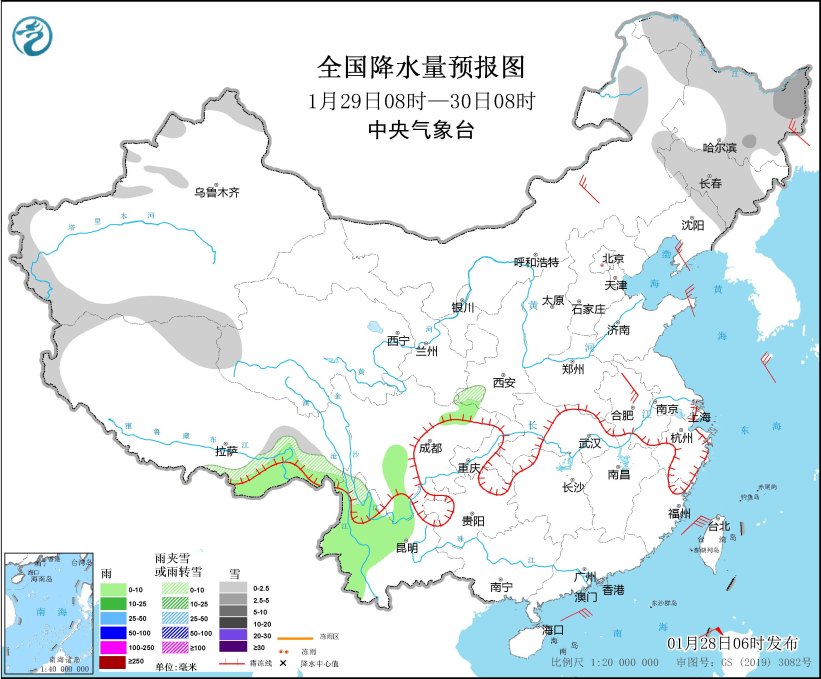 圖2 全國降水量預報圖(1月28日08時-29日08時)