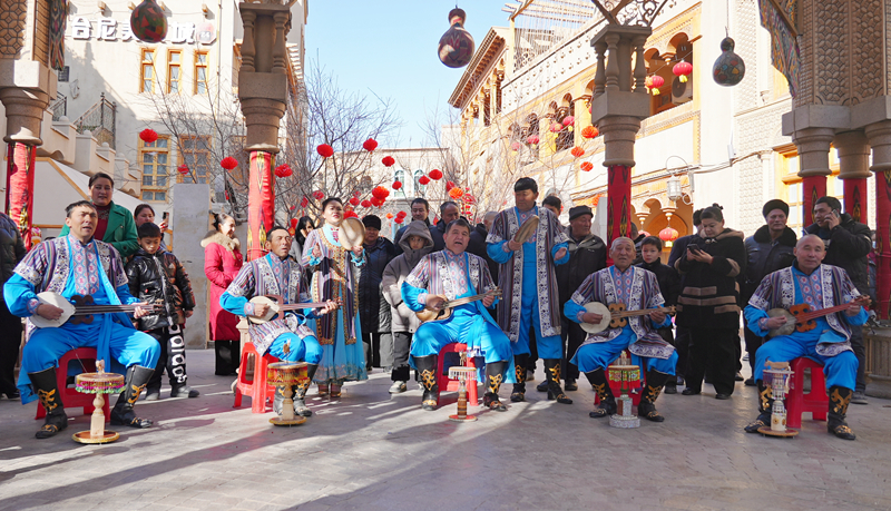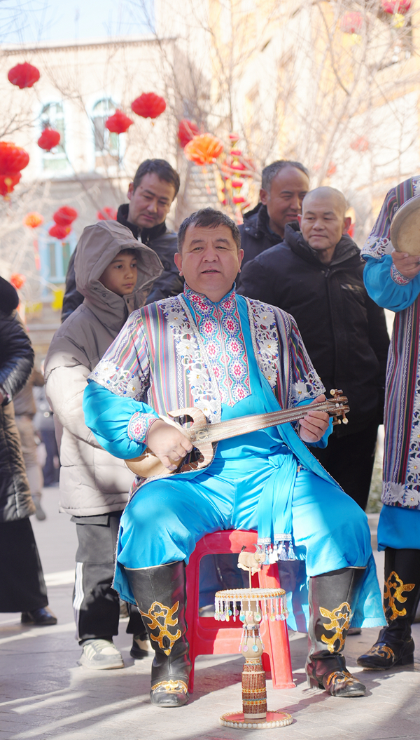 身穿靚麗演出服的民間藝人彈着熱瓦普唱着歌