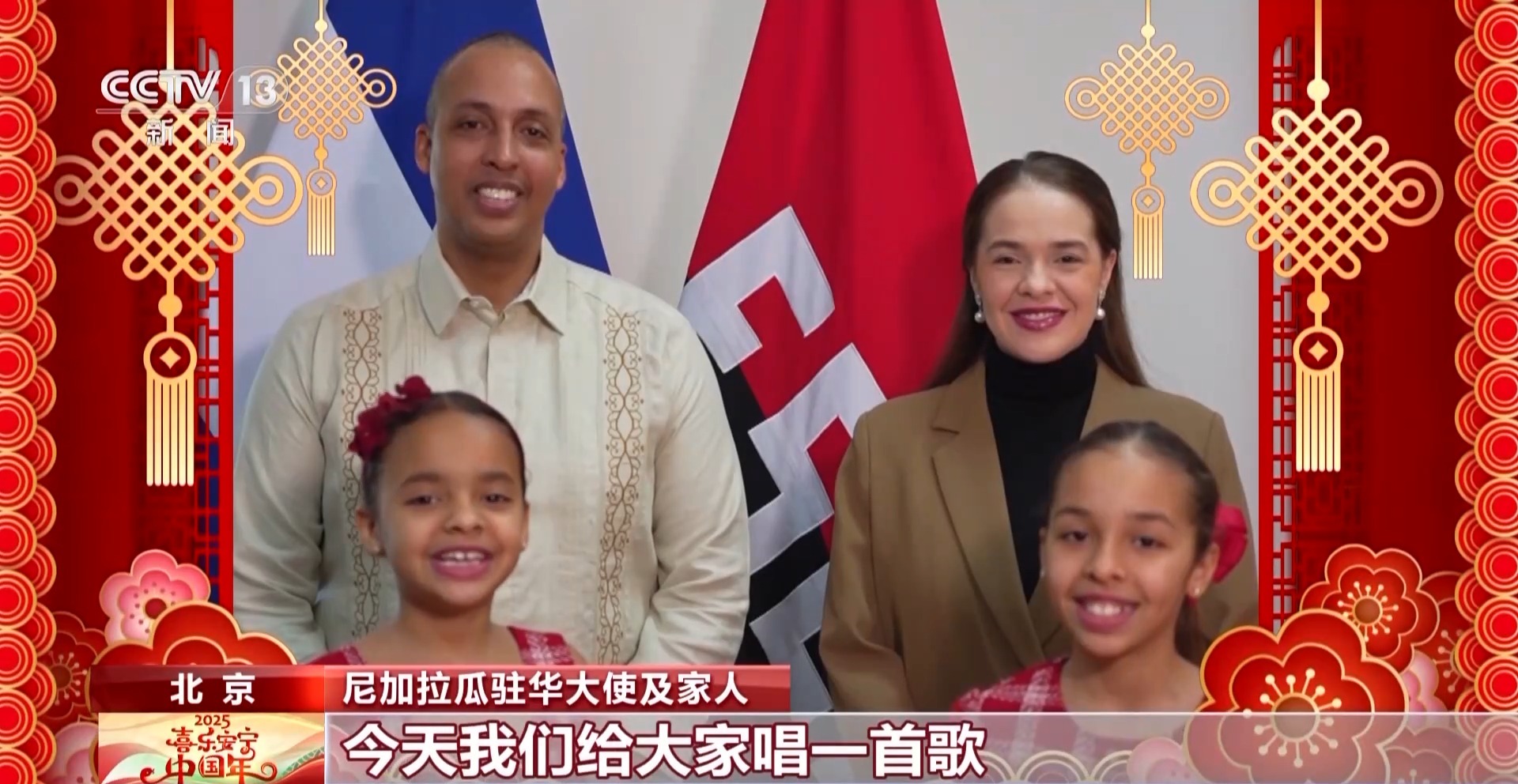 *尼加拉瓜駐華大使坎貝爾及家人:*今天我們給大家唱一首歌,新年好呀,新年好呀,祝賀大家新年好,我們唱歌,我們跳舞,祝賀大家新年好。