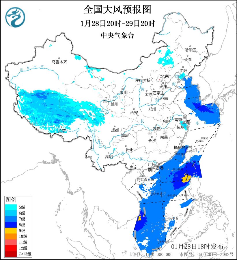 預計,1月28日20時至29日20時,西藏將有5~7級、陣風8~10級的大風,青海南部、川西高原北部、內蒙古中部、遼東半島、山東半島、浙江東部等地部分地區將有5~6級、陣風7~8級的大風;黃海大部海域、東海北部海域、台灣海峽、台灣以東洋麪、巴士海峽、南海大部海域將有7~8級、陣風9級的東北風,其中巴士海峽、南海東北部和西南部的部分海域風力可達9級、陣風10級。