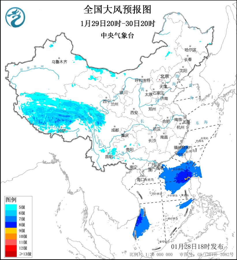 1月29日20時至30日20時,西藏將有6~8級、陣風8~11級的大風,青海南部、川西高原北部等地部分地區將有5~6級、陣風7~8級的大風;台灣海峽、巴士海峽、南海東部和西南部海域將有7~8級、陣風9級的東北風。