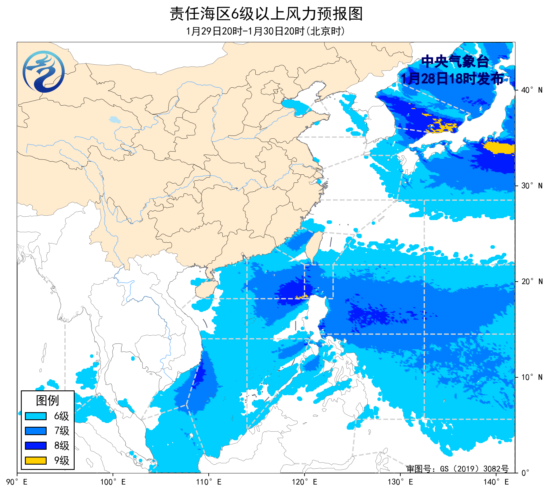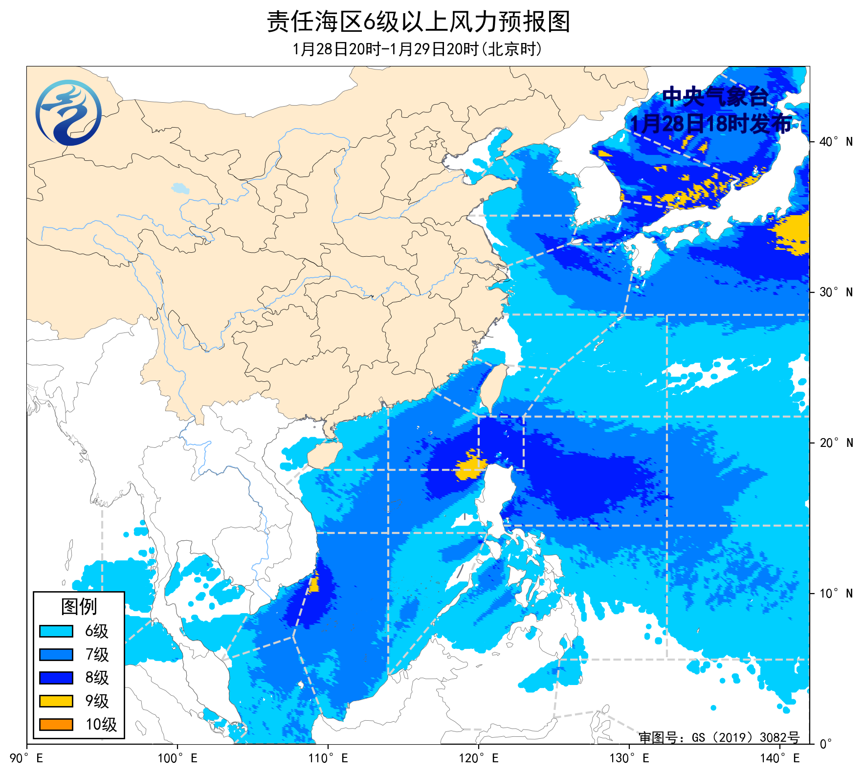 28日20時至29日20時,巴士海峽、南海東北部和中東部海域將有7~8級、陣風9級的東北風,黃海大部海域、東海北部海域將有5~7級、陣風8級的西北風,台灣海峽、台灣以東洋麪、南海西部和東南部海域將有5~7級、陣風8級的東北風,渤海海峽將有4~6級、陣風7級的西北風轉東北風,東海南部海域將有5~6級、陣風7級的偏北到西北風,瓊州海峽將有4~6級、陣風7級的東北風到偏東風。