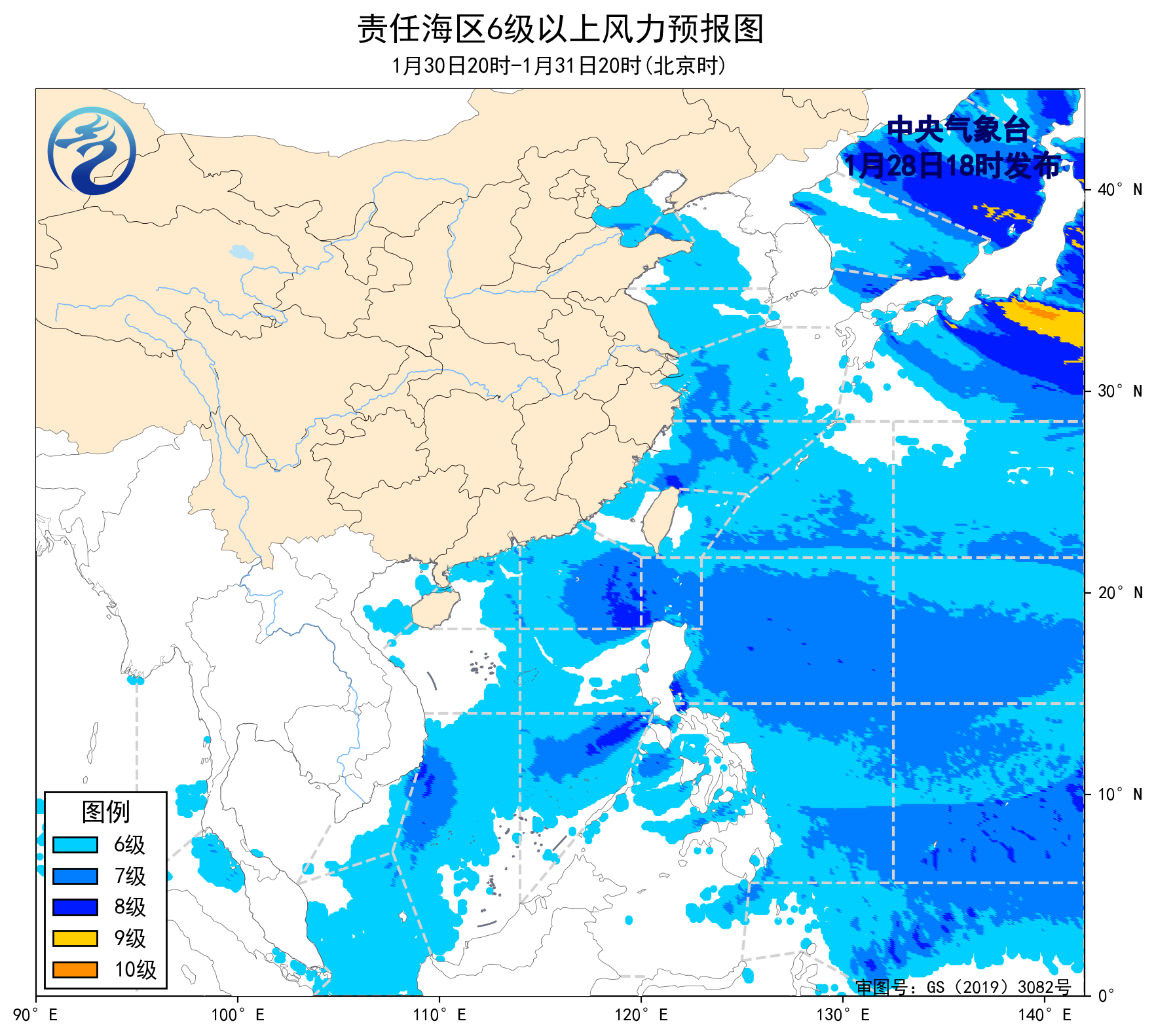1月28日02時至14時,渤海、台灣海峽、台灣以東洋麪、巴士海峽、南海東北部海域、南海西南部海域出現了6~8級、陣風9級的東北風或偏北風,渤海海峽、黃海大部海域、東海北部海域出現了5~7級、陣風8級的偏西風或西北風,東海南部海域、南海西北部海域、北部灣、南海中西部海域、南海東南部海域出現了5~6級、陣風7級的東北風或偏北風。
