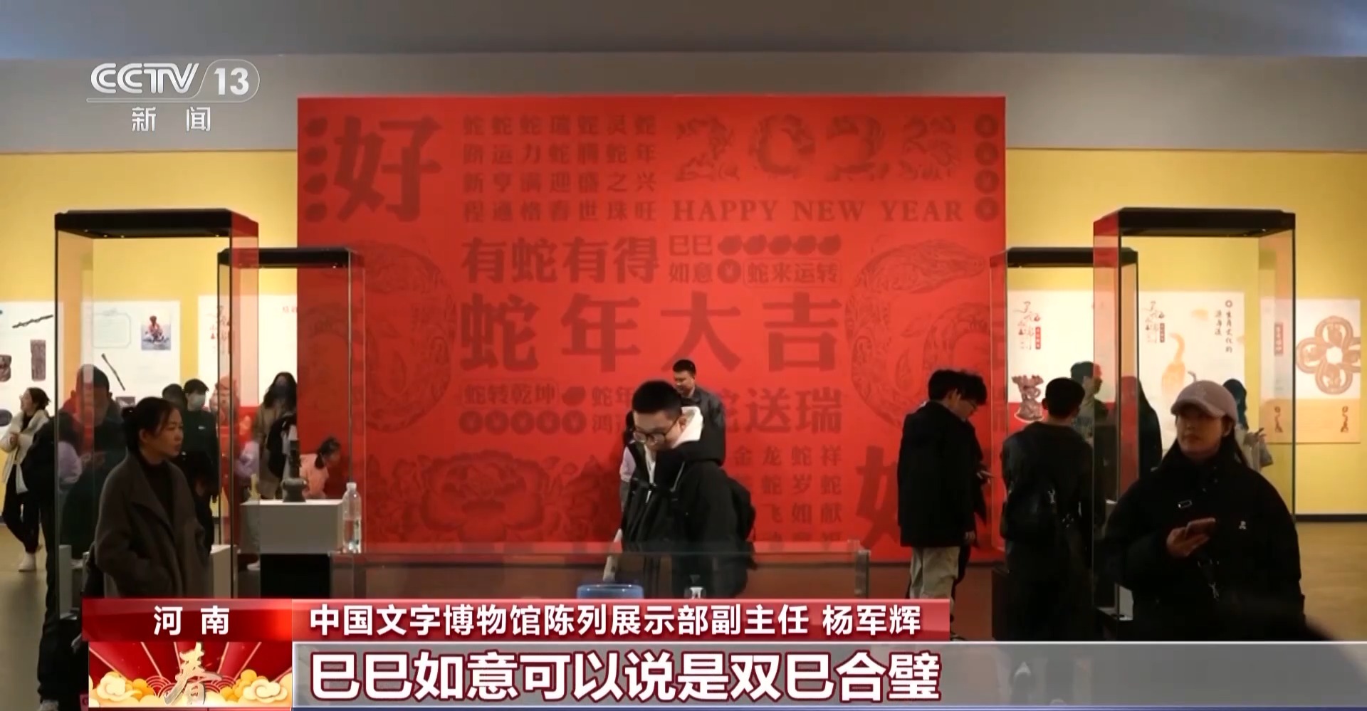 *中國文字博物館陳列展示部副主任 楊軍輝:*蛇象徵着繁衍永生、智慧機敏,堅韌不拔。巳巳如意可以説是雙巳合璧,寓意事事如意,飽含喜慶美滿的家國祝福,彰顯着中華民族生生不息的精神力量。