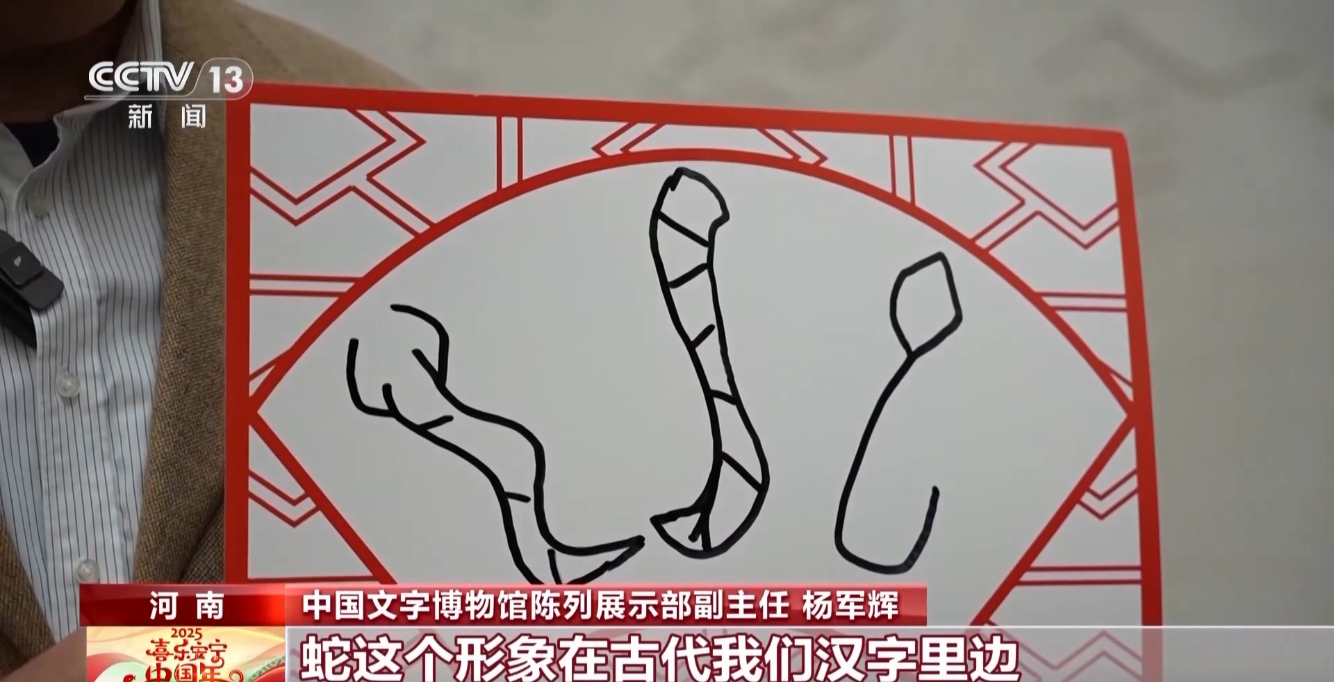*中國文字博物館陳列展示部副主任 楊軍輝:*這個形狀的蛇,有一個非常典型的三角形的頭部,身上還有一些鱗片。有一些是簡筆,但是上邊三角形的頭部是要保留的,長長彎曲的身體是要保留的。蛇這個形象在古文字裏演化成了三個方向: