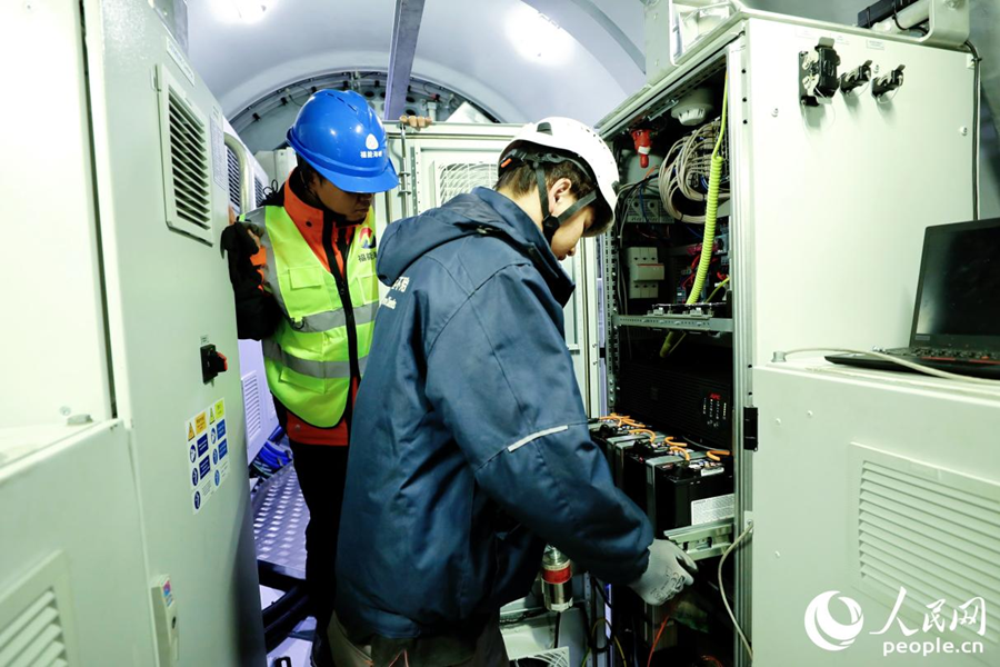 檢修開始了。“把螺絲刀遞給我。”吉榮斌接過工程師速剛遞來的工具,身體緊貼着風機的圓弧形牆壁,半蹲着擰起傳感器的螺絲。速剛則在一旁拿出筆記本電腦,做測試、記數據。整個檢修過程長達一小時,汗水浸濕了大家的衣裳。