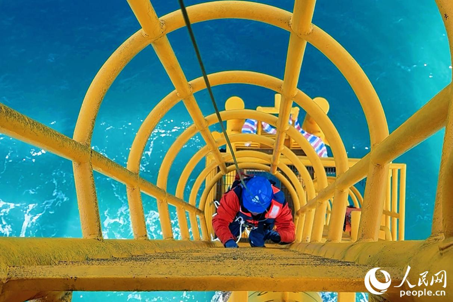 吉榮斌繫好安全繩,沿着階梯逐級爬上平台。人民網 李唯一攝