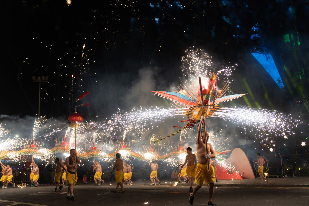 夜幕降臨,點燃觀眾熱情的不僅只有英歌舞。在客家文化的重要發源地梅州,埔寨火龍表演現場火光沖天,龍影翻騰。
