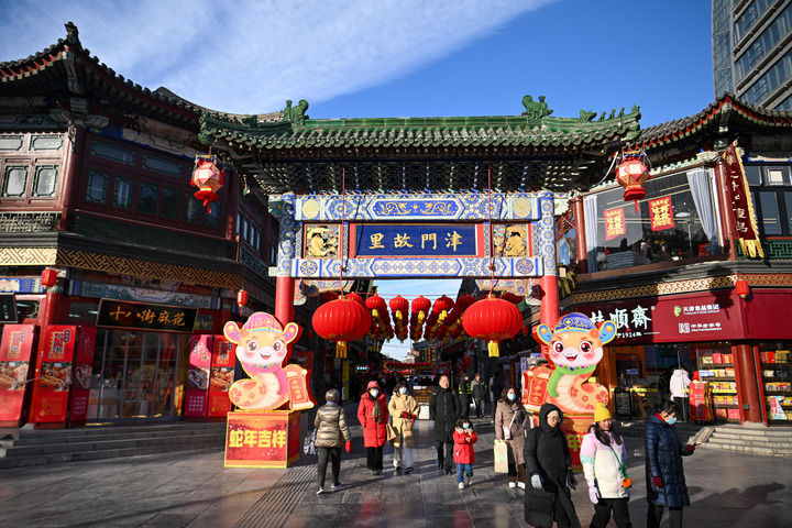 天津古文化街的戲樓廣場,人羣熙熙攘攘。快板明快清脆的節奏聲聲入耳,四隻憨態可掬的“金獅”翻騰跳躍,高蹺隊伍迎面走來、服飾五彩斑斕……節日的喜慶勁兒展現得淋漓盡致。