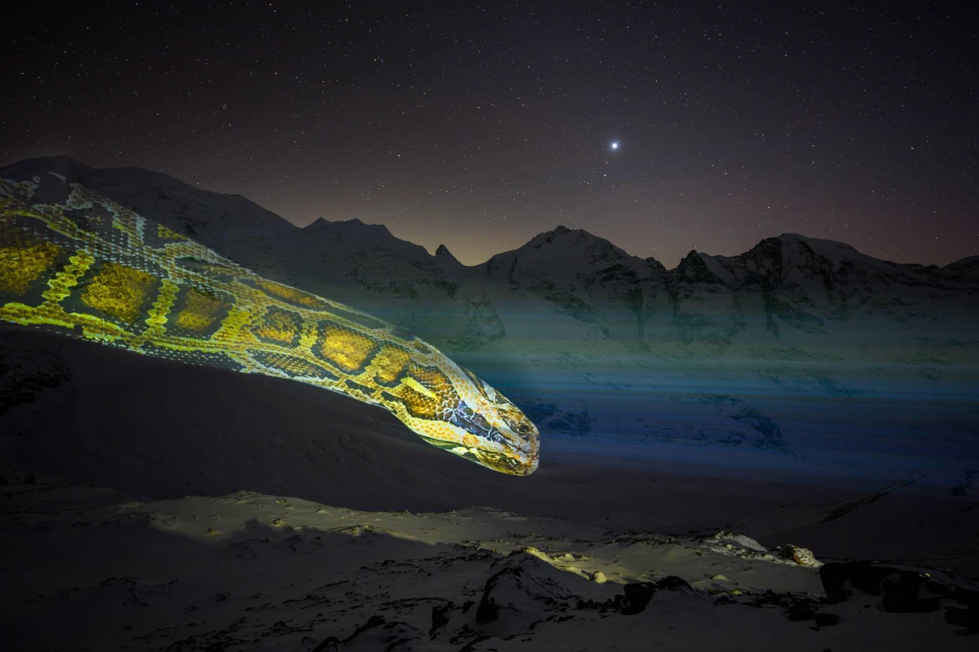 當地時間1月28日,瑞士蓬特雷西納佩爾斯冰川上演了一場壯麗的燈光秀。一條長達3.5公里的緬甸虎蟒巨型投影,蜿蜒在阿爾卑斯山的佩爾斯冰川之上,宛若一幅動態的藝術畫卷。