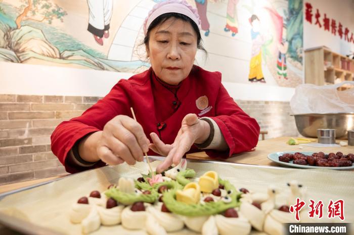 1月10日,麪塑手藝人續愛花製作“蛇盤兔棗山麪塑”。 中新社記者 韋亮 攝
