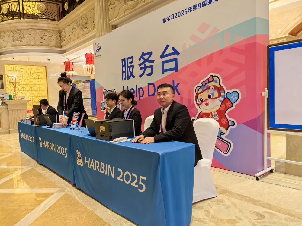 在酒店大廳,亞冬會元素的背景板前,工作人員正在服務枱做着入住的接待準備工作;媒體工作間內桌椅擺放整齊,電腦等設備一應俱全;醫療室內,醫療衞生經理李百韜和同事清點着藥品……
