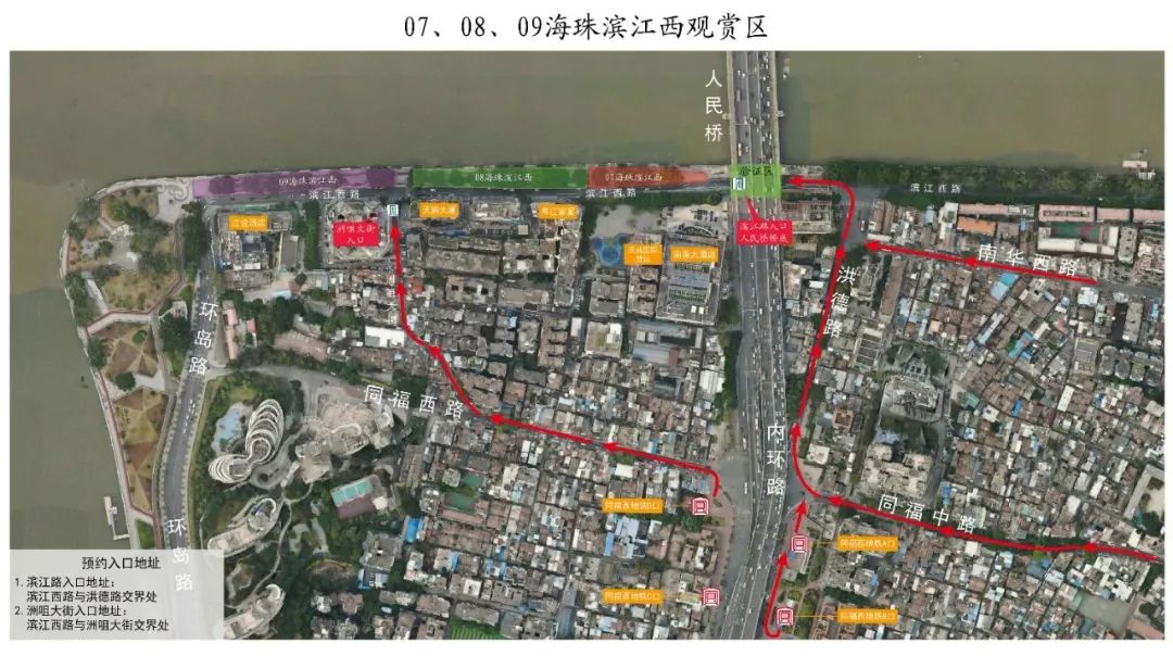 (一)黃沙大道(不含,華譽一街路口至御景1號門口段)、譽江路、華譽一街合圍區域,內環路A線六二三路出口、人民橋東西側便道(西堤二馬路至沿江西路)、新基路、靖遠路、新堤三橫路、新堤一橫路、沿江路(解放路至白天鵝賓館引橋口)等區域(路段)。