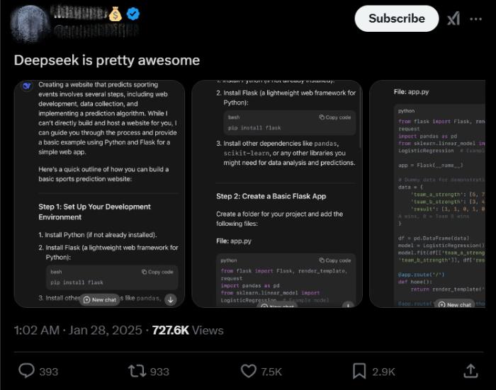 一名外國網友向它發起提問,“如何創建一個預測體育賽事的網站”,並在社交媒體平台上分享了這份詳盡的“手把手教學”式回答,配文“DeepSeek真的很贊”。