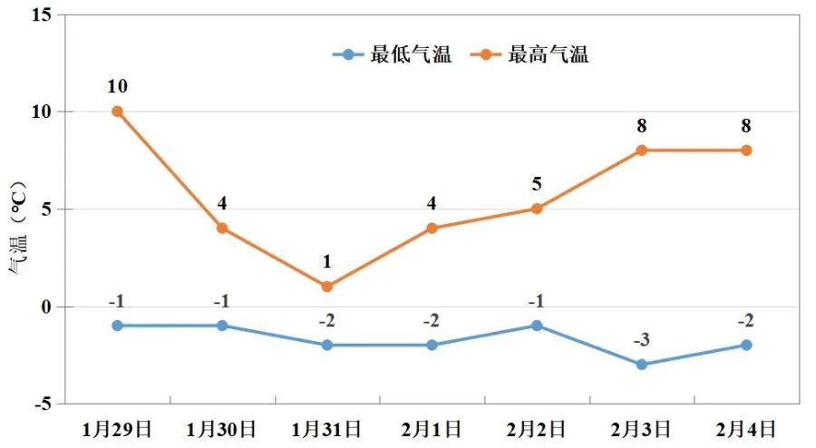圖1 1月29日至2月4日鄭州氣温變化圖(單位:℃)