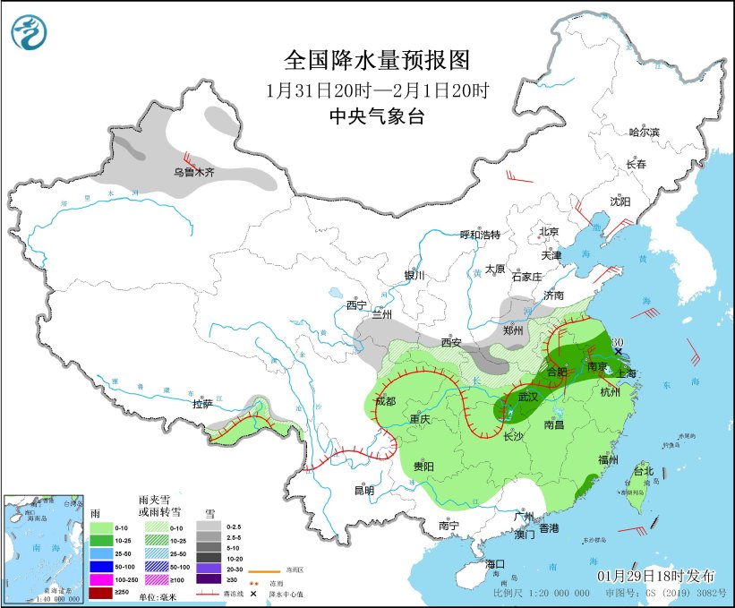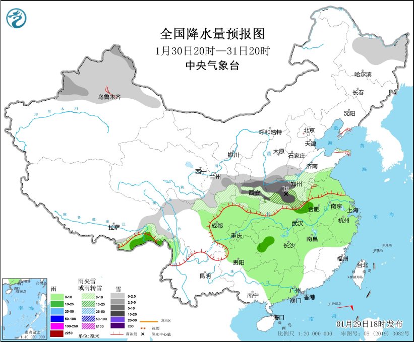 1月30日至2月2日,中東部有較大範圍雨雪過程。甘肅東部、陝西南部、華北南部、黃淮南部、江漢北部等地有小到中雪或雨夾雪,陝西南部、湖北西北部、河南西部、甘肅東南部等地部分地區有大雪,局地暴雪(10~15毫米)。上述地區新增積雪深度2~5釐米,局地8釐米以上,南方大部地區有小到中雨,局地大雨。