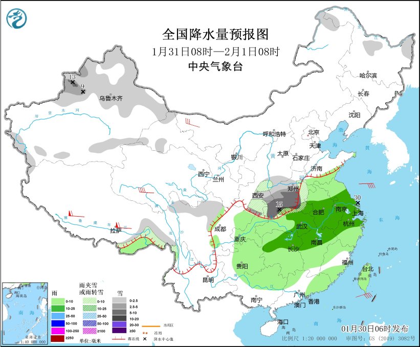 1月30日至2月2日,中東部有較大範圍雨雪過程。甘肅東部、陝西南部、山西南部、黃淮西部、江漢北部等地有小到中雪或雨夾雪,陝西南部、湖北西北部、河南西部、甘肅東南部等地部分地區有大雪,局地暴雪(10~15毫米)。上述地區新增積雪深度2~5釐米,局地8釐米以上,南方大部地區有小到中雨,局地大雨。