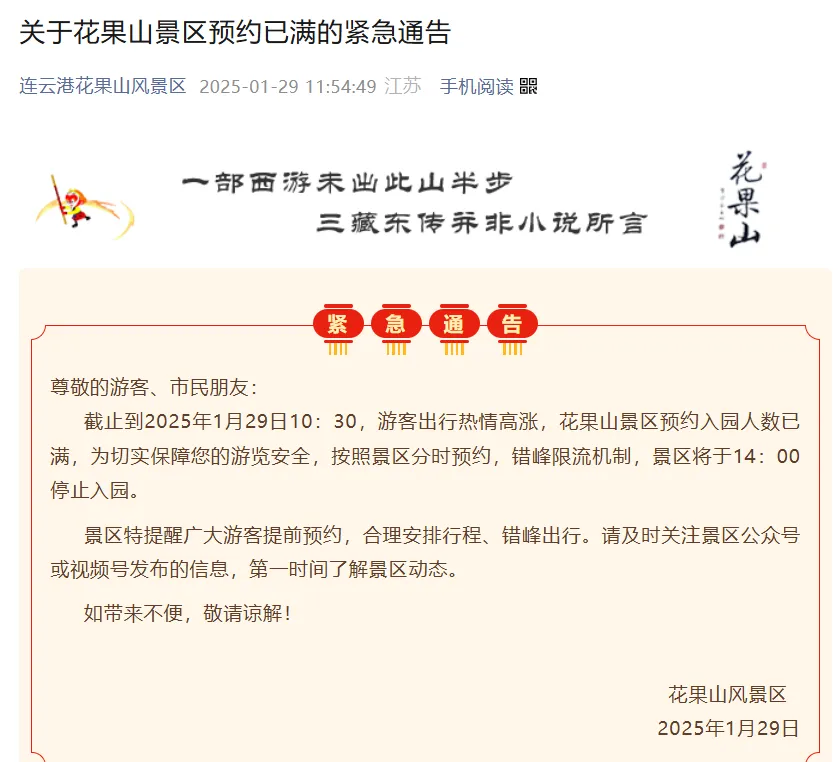 江蘇花果山景區發佈預約已滿的緊急通告。