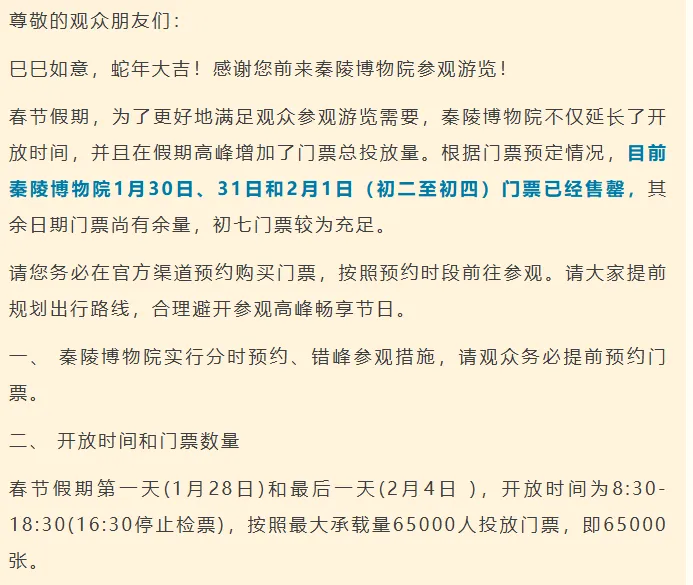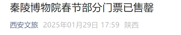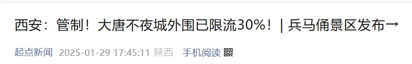 1月29日晚,大唐不夜城外圍已限流30%。秦陵博物院春節部分門票已售罄。