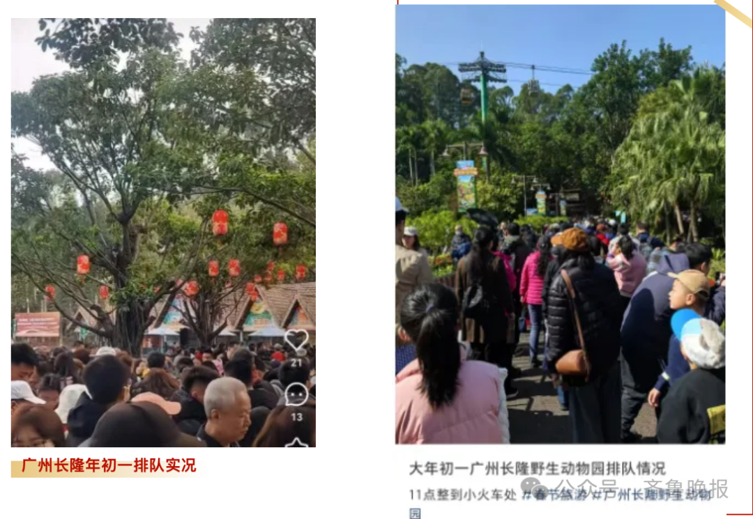 初一一早8時許,廣州長隆門外就已經開始排隊,據網友在社交平台發帖表示,“還沒到開門時間,門口已排起長隊。”“進入園區後小火車也要排隊。”