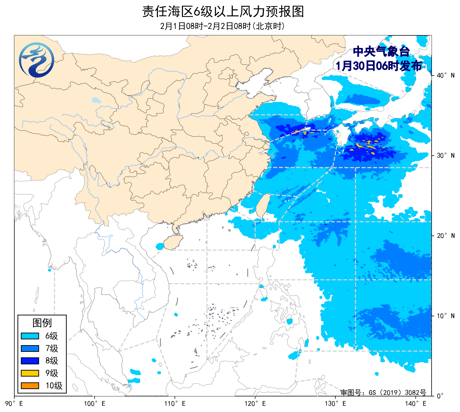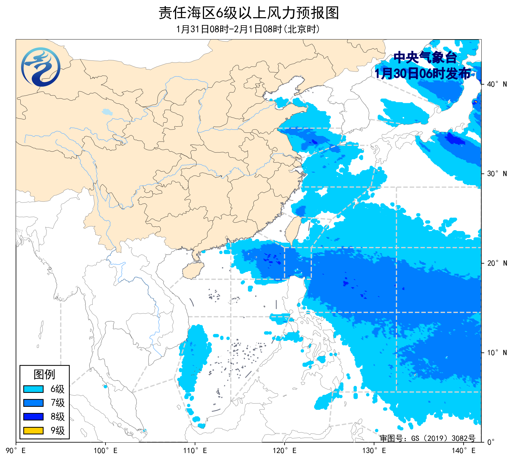 1月29日14時至30日02時,東海南部海域、台灣海峽、台灣以東洋麪、南海大部海域出現了5~7級、陣風8級的東北風,巴士海峽、南海東北部海域出現了6~8級、陣風9級的東北風。
