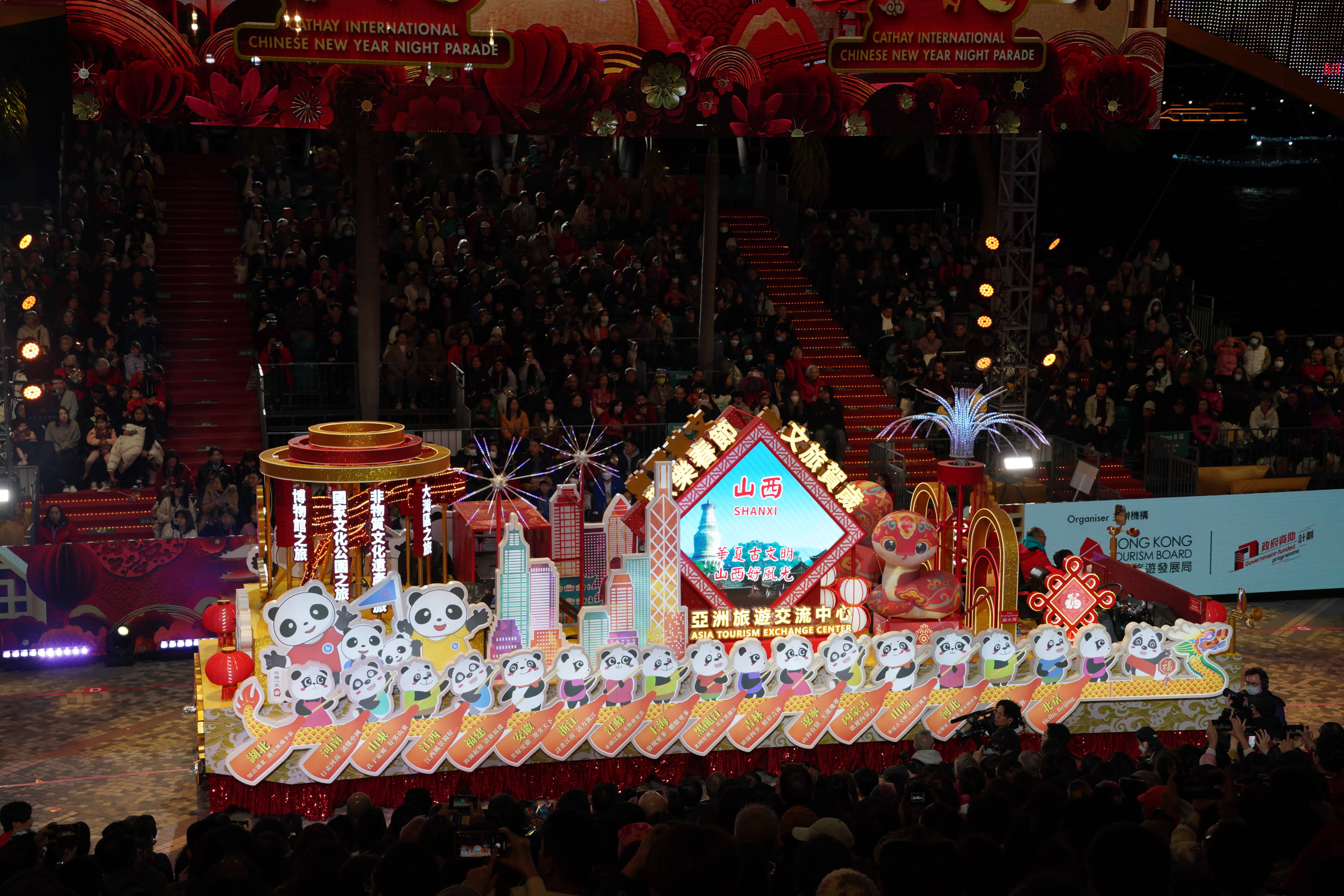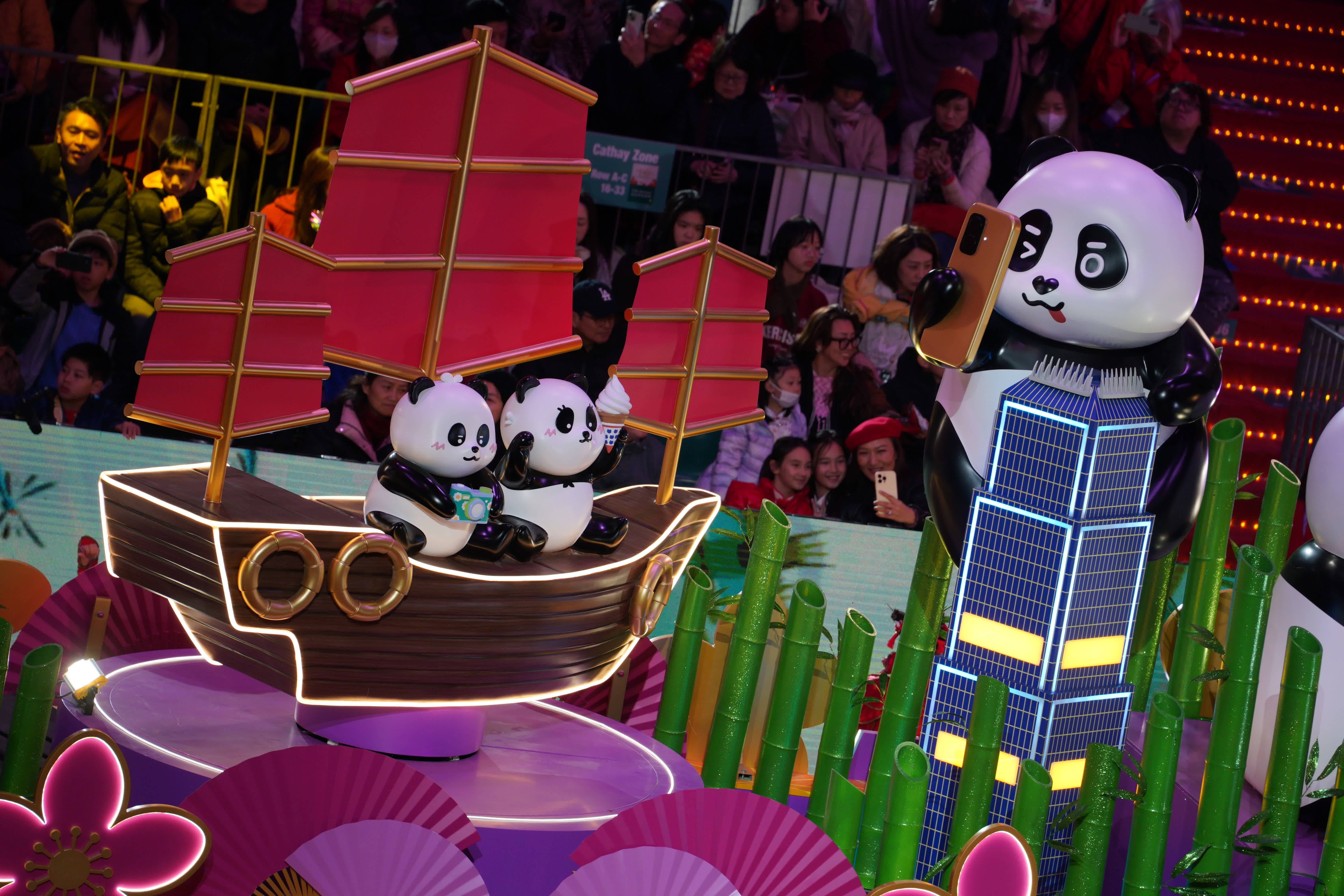 據星島新聞網報道,巡遊中的花車充滿熊貓元素。由香港文體旅局、香港旅發局及香港海洋公園呈現的“熊貓暢遊香港號”,花車上的香港大熊貓家族,誠邀世界好友跟隨它們的足跡一同暢遊香港,探索香港特色文化及標誌性地標。由亞洲旅遊交流中心呈獻的“歡樂春節•文旅賀歲”花車,同時融入“你好中國!”標誌、吉祥蛇形象、“大熊貓一家”及香港標誌性建築形象。